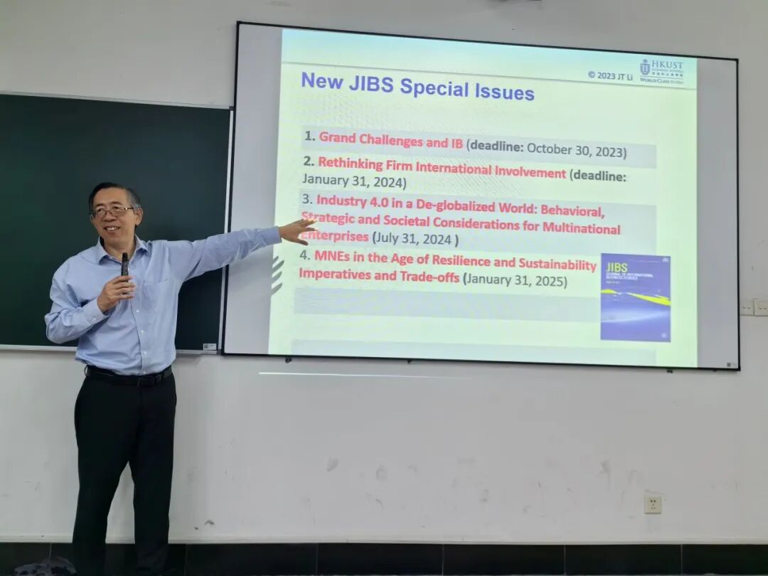 在上午的主题讲座中,李家涛教授首先介绍了“数字经济时代的全球战略、中国‘一带一路’”等新兴市场国际商务领域的研究趋势和方向和国际商务顶刊JIBS相关主题的特刊征稿。随后,他详细汇报了《在东道国申请专利的信号作用》的主题论文,该论文创新性提出了双边政治紧张的概念,并从信号理论的视角探究在双边政治关系紧张的情景下,子公司如何在东道国申请专利以获取合法性的问题。最后,与会教师和学生就“定性与定量研究如何有效结合,变量精准测量、理论视角选择”等学术问题与李教授进行了热烈的交流和探讨。