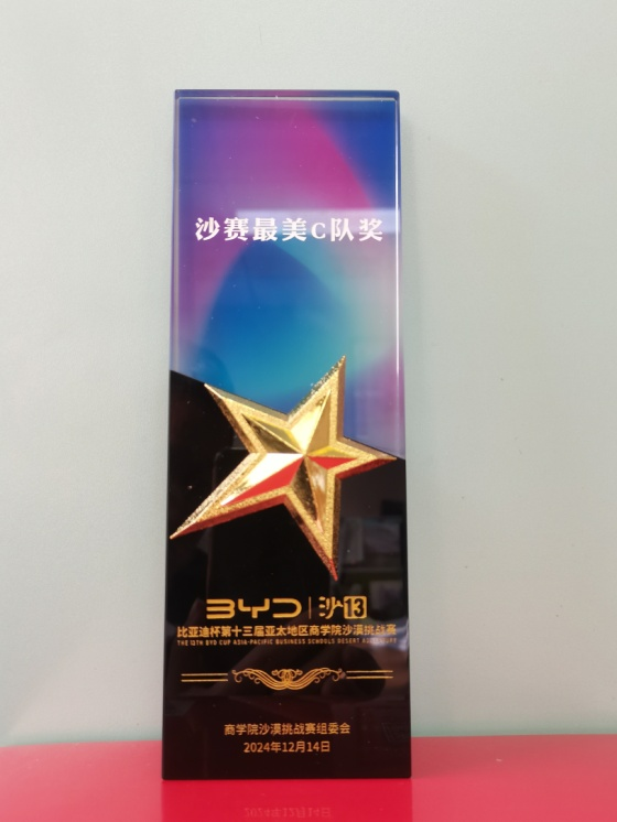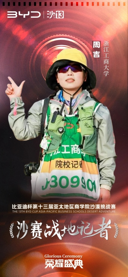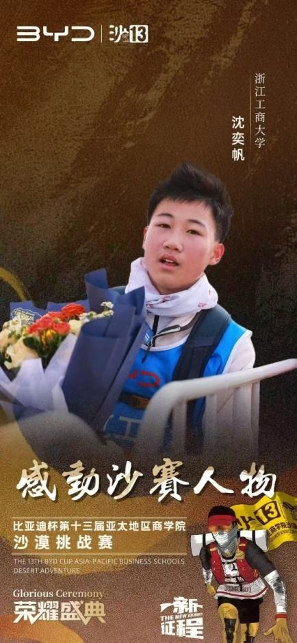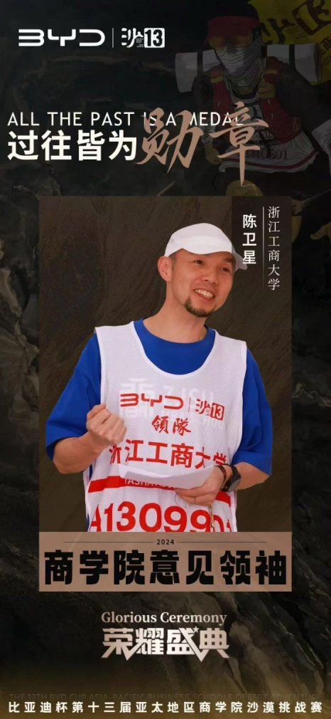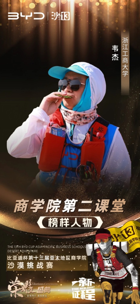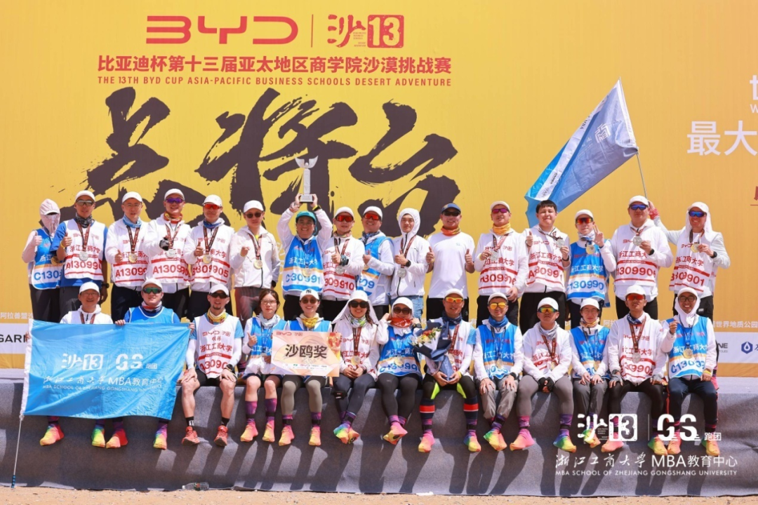 今年5月,浙江工商大学MBA代表队在内蒙古腾格里沙漠经过三天70公里的艰苦拼搏,勇夺赛事最高荣誉——沙鸥奖。秉持着永恒的初心与使命,致力于传承并发扬沙赛精神,沙赛组委会于本次活动现场隆重颁发了沙13个人荣誉与团队荣誉等多项荣誉奖项。浙江工商大学荣获沙赛新锐商学院奖、沙赛最美C队奖等两个A类团队奖项。MBA教育中心韦杰老师荣获“商学院第二课堂榜样人物”,队长陈卫星荣获“商学院意见领袖”,周吉荣获沙赛“战地记者”,沈奕帆荣获“感动沙赛人物”等荣誉称号。