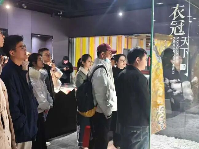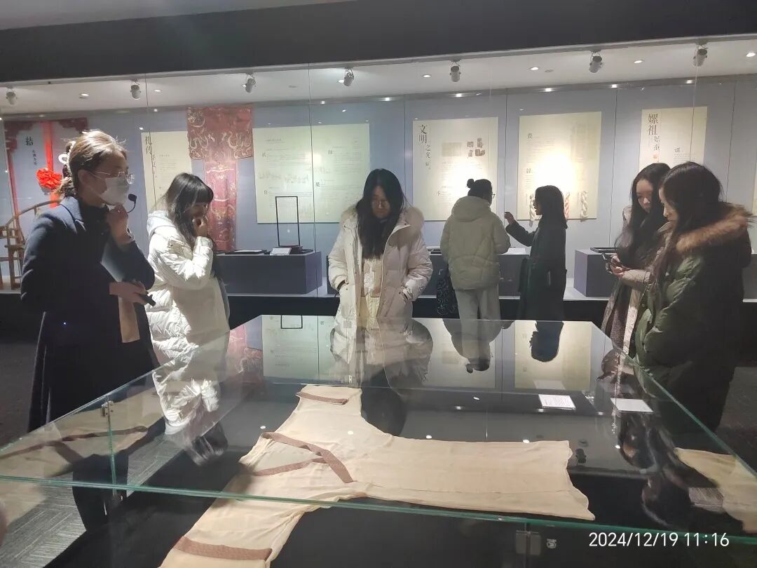 接着,王老师带领大家前往浙江省内首座民办丝绸文化博物馆——万事利丝绸文化博物馆。这座集现代高科技4D演绎厅、精美丝织文物展陈、艺术品陈列及非物质文化遗产艺术活动体验于一体的博物馆,为同学们开启了一场穿越古今的丝绸文化之旅。