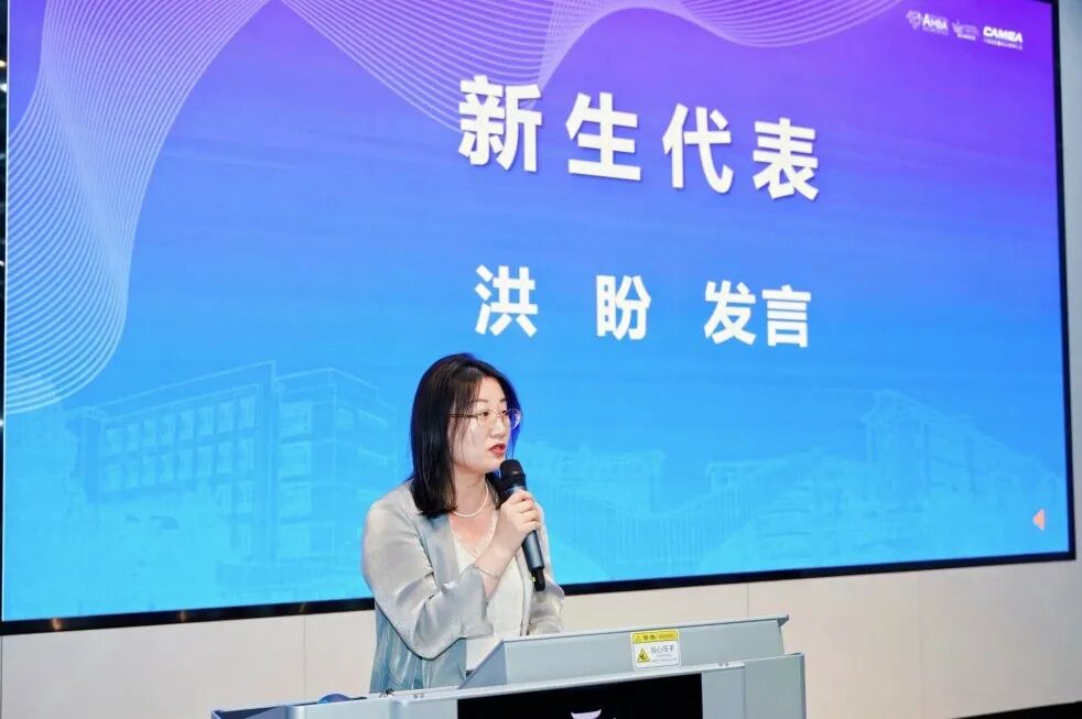 新生代表,25MPM2班洪盼发言。她对老师们表示感谢,并呼吁同学们在未来两年内不断学习锤炼,将先进的管理理念和方法赋能职业发展,共同推进行业进步。她祝愿大家以归零的心态重新出发,在新的道路上学有所成。