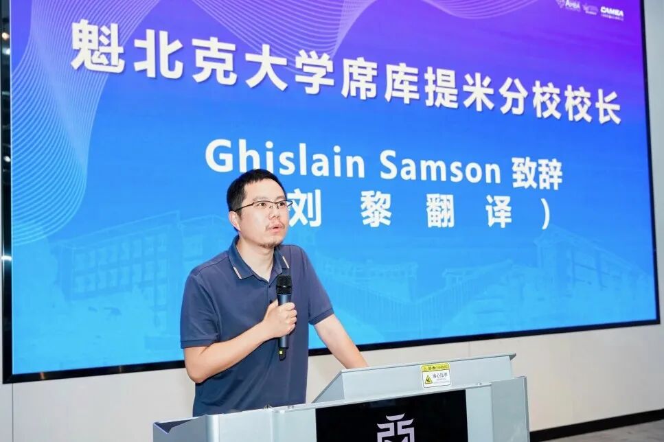 魁北克大学席库提米分校校长Ghislain Samson 首先通过视频发表致辞(刘黎翻译),他介绍了魁北克大学项目管理学科的办学理念以及在人才培养方面的成就,并祝愿同学们在求学之路上,勇于突破,勇毅前行,不忘初心,在学术追求中取得圆满成功。