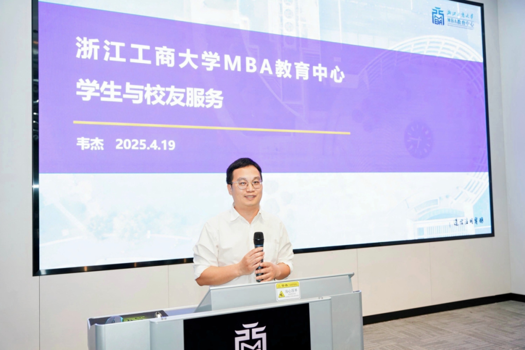 MBA学生与校友事务部主管韦杰老师介绍了学院为在校生及广大校友提供的丰富多样的服务内容,着重指出学院致力于打造紧密的师生交流平台,构建完善的校友服务体系,全面支持学生的学习成长和校友的职业发展。