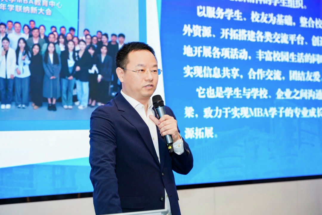 MBA第二十届联合会主席王雁峰介绍了MBA学生联合会及其活动开展情况。学生联合会作为搭建学生、学校和校友之间的交流平台,致力于促进三方的深度互动与合作,他鼓励新生们积极参与各类交流活动,共同为丰富校园生活贡献力量。