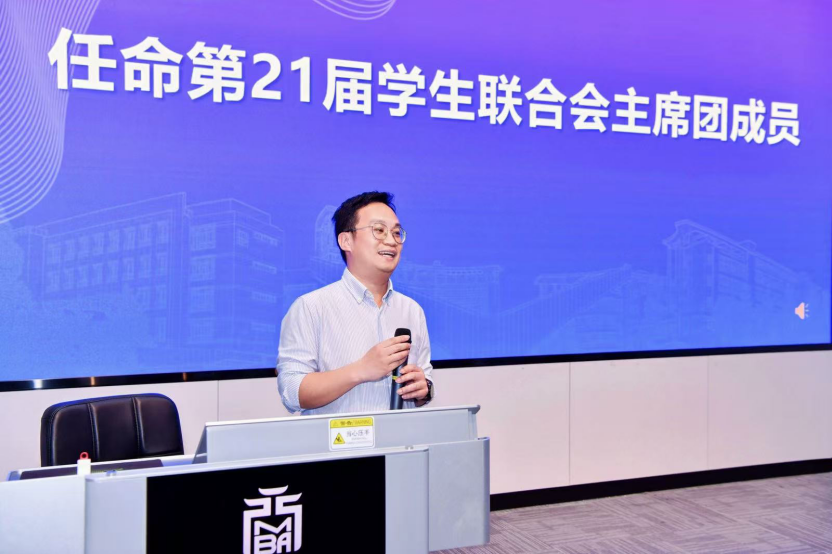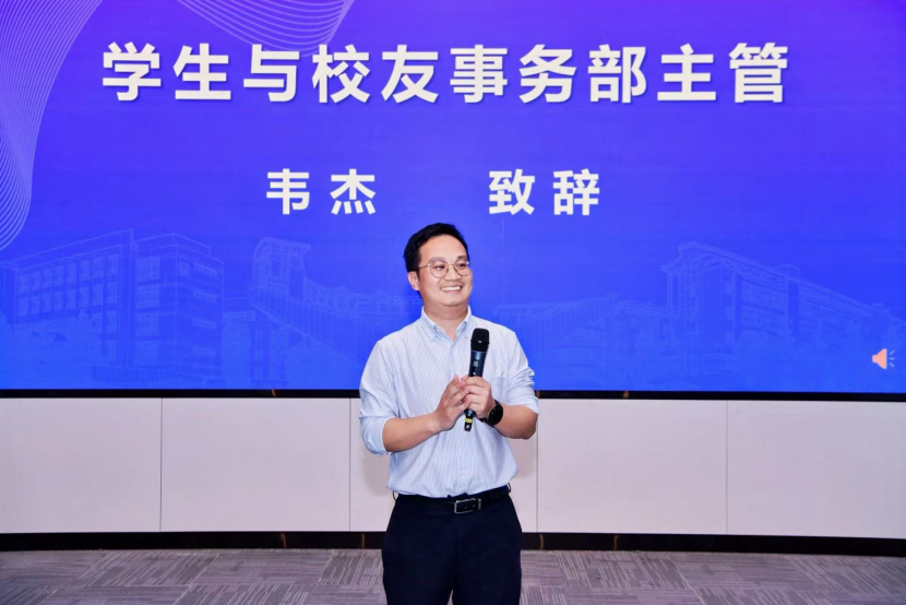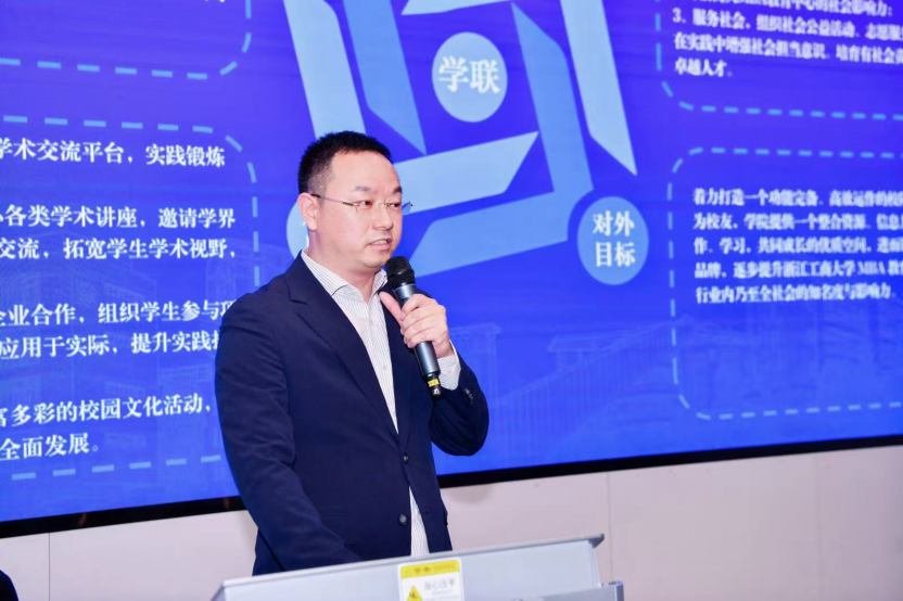 浙江工商大学MBA学生与校友事务部主管韦杰总结讲话,他祝贺新一届主席团展现领导力与前瞻性,并感谢历届成员传承积淀,夯实学联基础,同时期许以创新思维优化学生活动机制,开拓发展新局面。