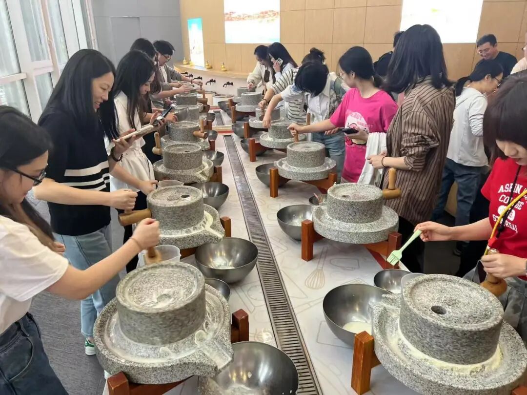 在品牌体验馆内,工作人员以“一杯豆浆的进化史”为主线,生动展示了九阳从单品突破到全品类布局的发展历程。同学们还亲身体验了手工石磨豆浆的制作过程,在古朴的石磨前轮流尝试研磨黄豆,感受传统工艺的魅力,并与现代智能化设备进行对比,深刻理解九阳“以用户需求定义创新”的核心理念。